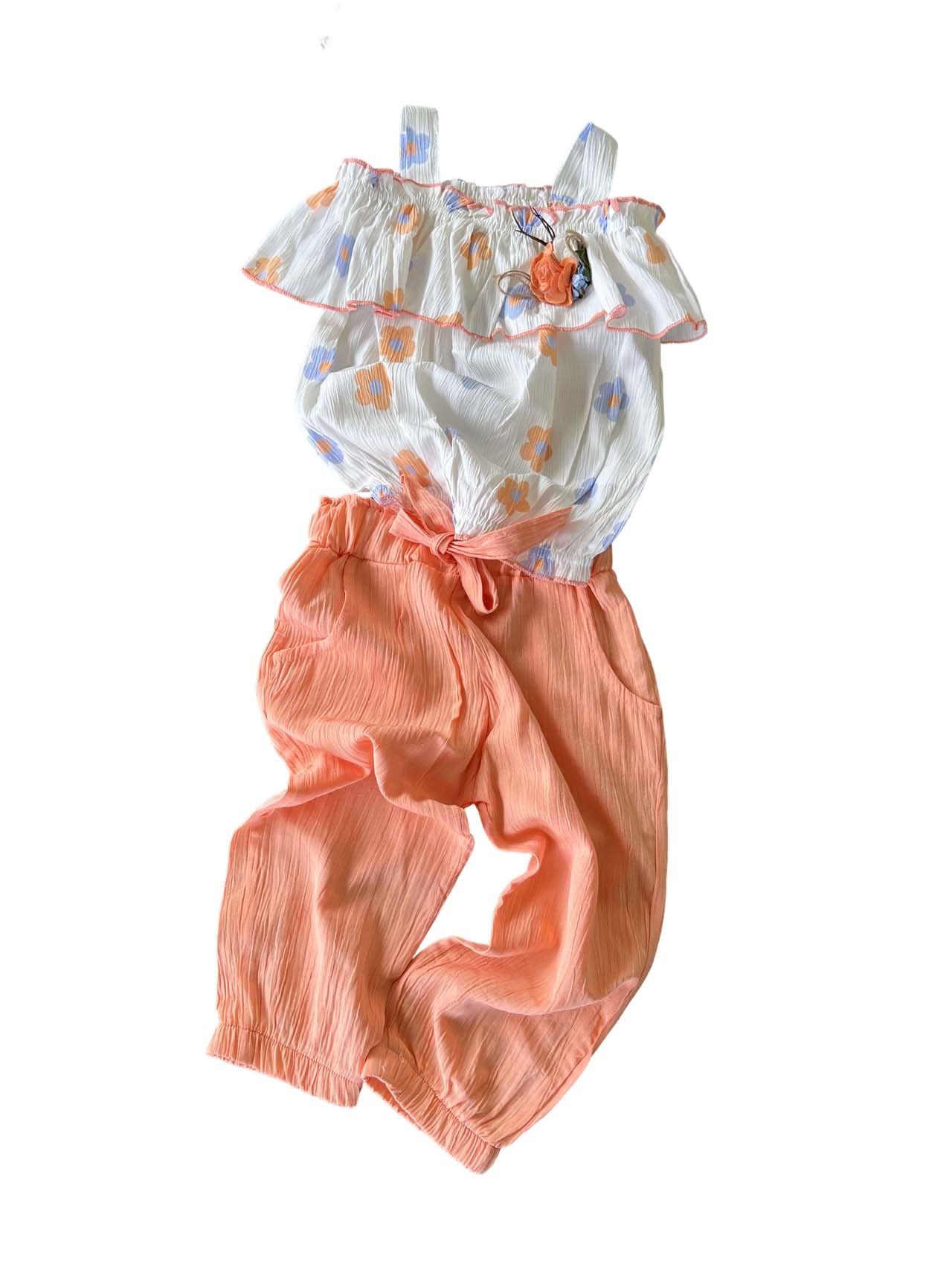 Compleul este din doua piese, culoare alb-portocaliu pentru fetite. Este confectionat din bumbac . Compleul se potriveste unei tinute moderne.Compleul este confectionat din materiale moi si placute la atingere, pentru confortul dumneavoastra. Compleul din doua piese este un model modern ce te va pune in evidenta.