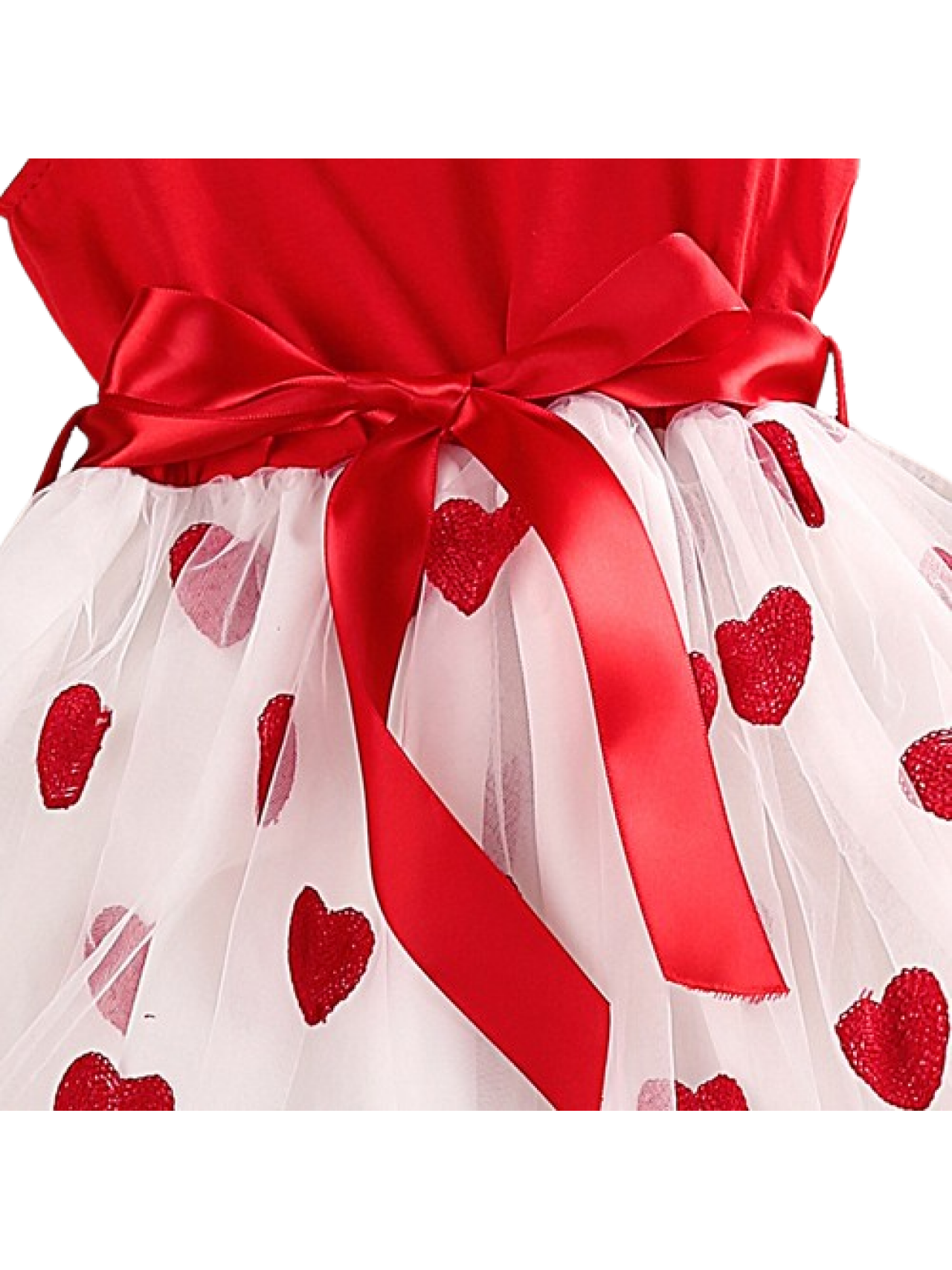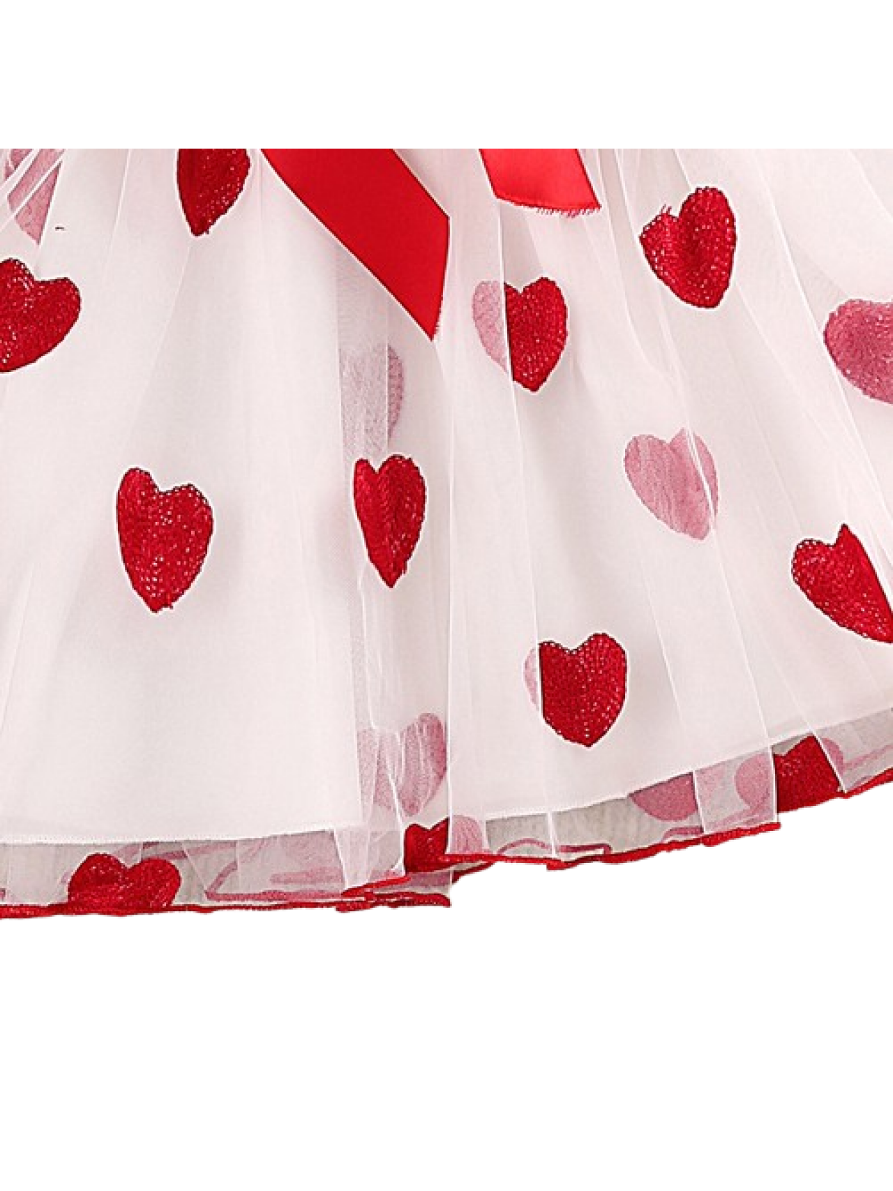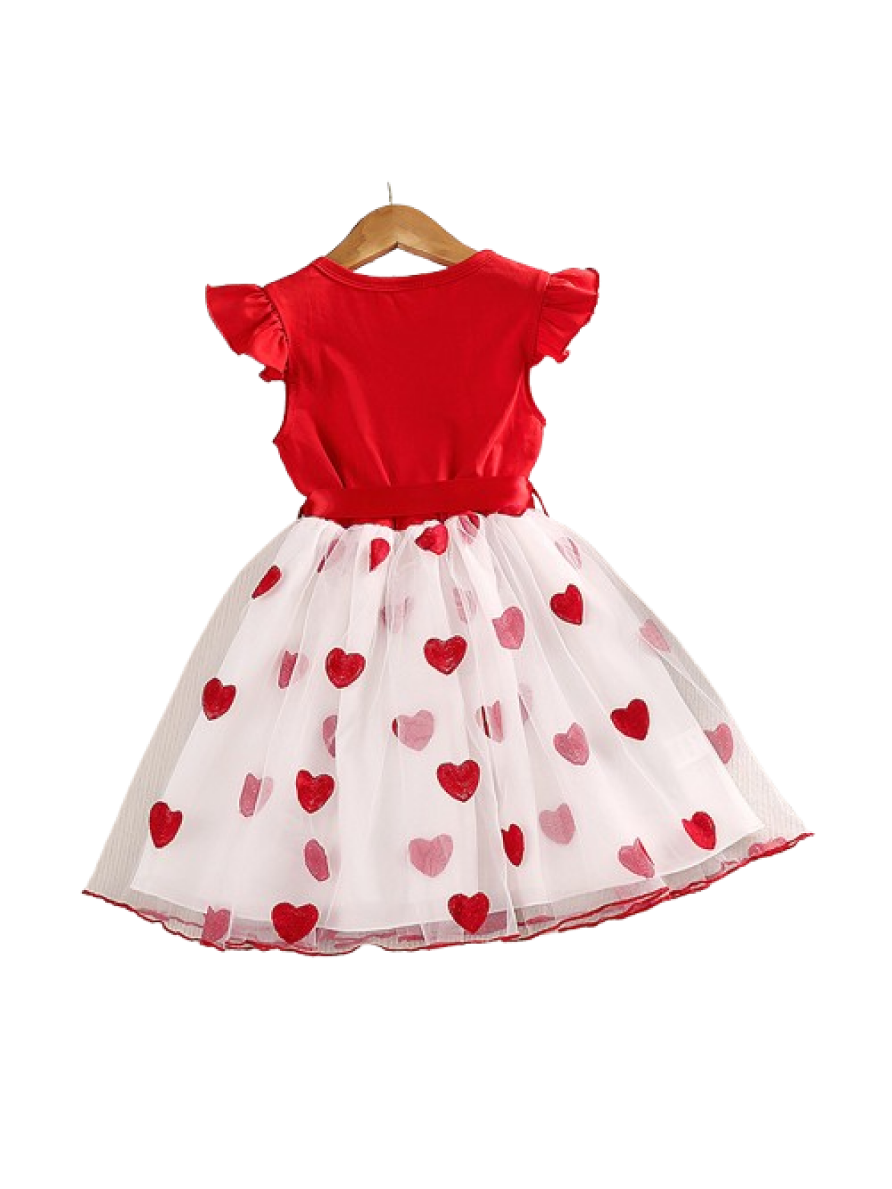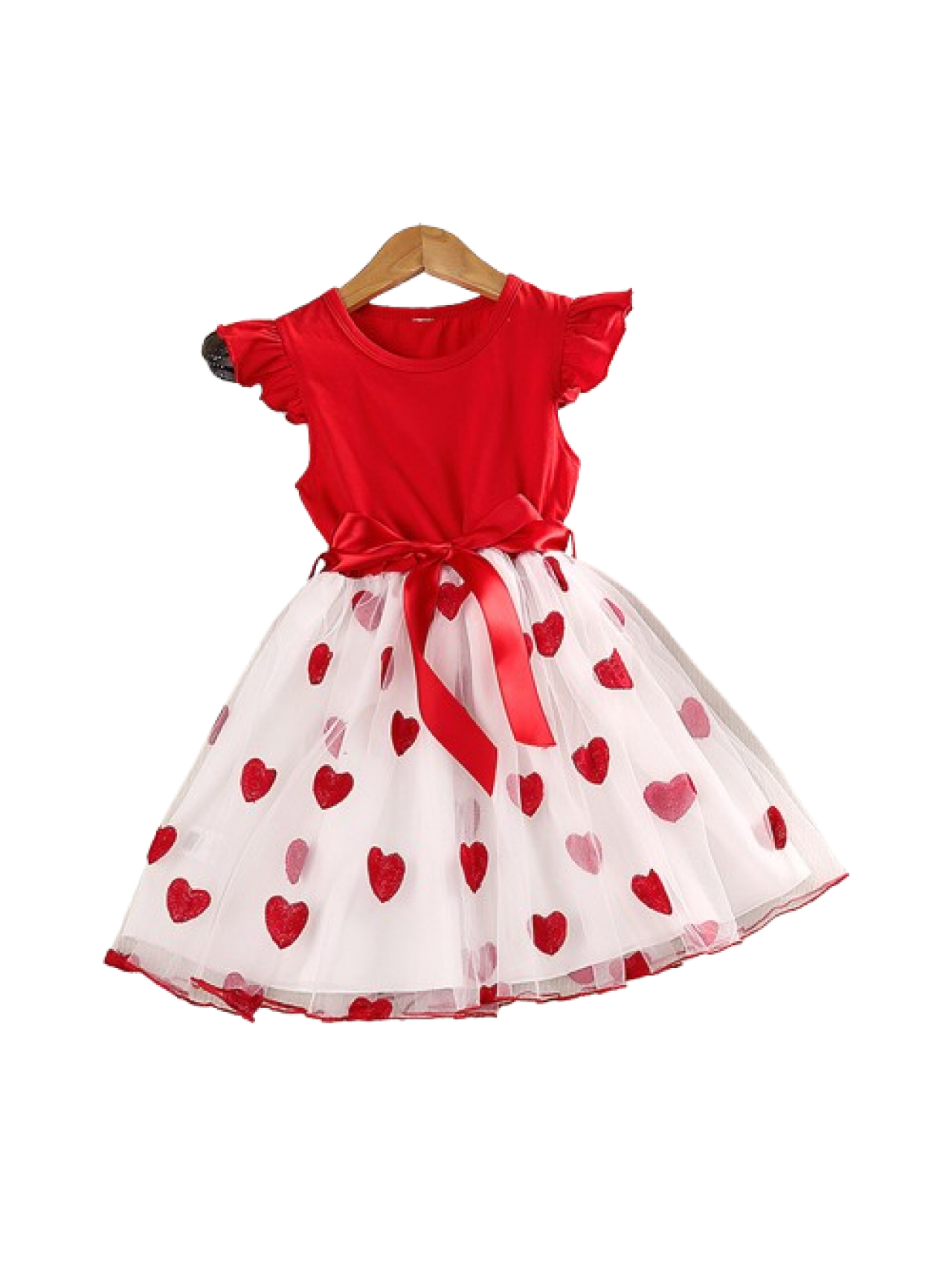 Rochiță adorabilă pentru fetițe, perfectă pentru zilele călduroase de vară sau ocazii speciale. Partea de sus este roșie, cu mânecuțe scurte și volănașe delicate, iar talia este accentuată de o fundiță din satin roșu. Fusta este din tul alb decorat cu inimioare roșii, oferind un aspect vesel și jucăuș. O combinație fermecătoare de confort și stil, potrivită pentru aniversări, ședințe foto sau plimbări în familie.
