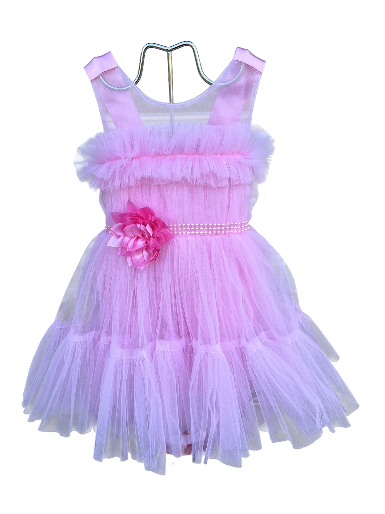 Rochita eleganta roz cu mini trena, se potriveste unei tinute elegante. Este decorata elegant cu o floare roz si un cordon din perlute. Pentru o imbracare facila rochita este prevazuta cu banda elastica in partea din spate. Rochita eleganta este confectionata din materiale moi si placute la atingere, pentru confortul dumneavoastra. Rochita eleganta , te va pune cu siguranta in evidenta la petreceri si va transforma fiecare eveniment intr-o amintire magica.