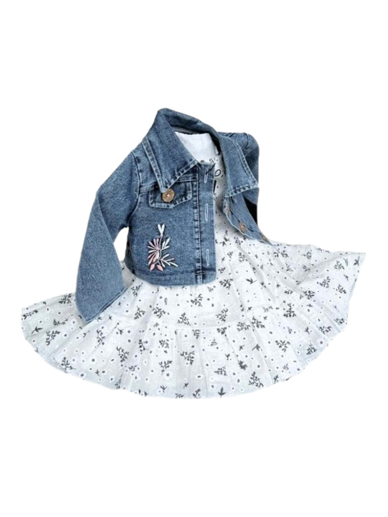 Set format din jachetă de blugi si rochita alba bumbac100%,accesorizată cu broderie. Setul asigură protecție în zilele mai răcoroase, iar materialul moale este ideal pentru pielea sensibilă a copiilor.Acest set este o alegere excelentă pentru garderoba celor mici.