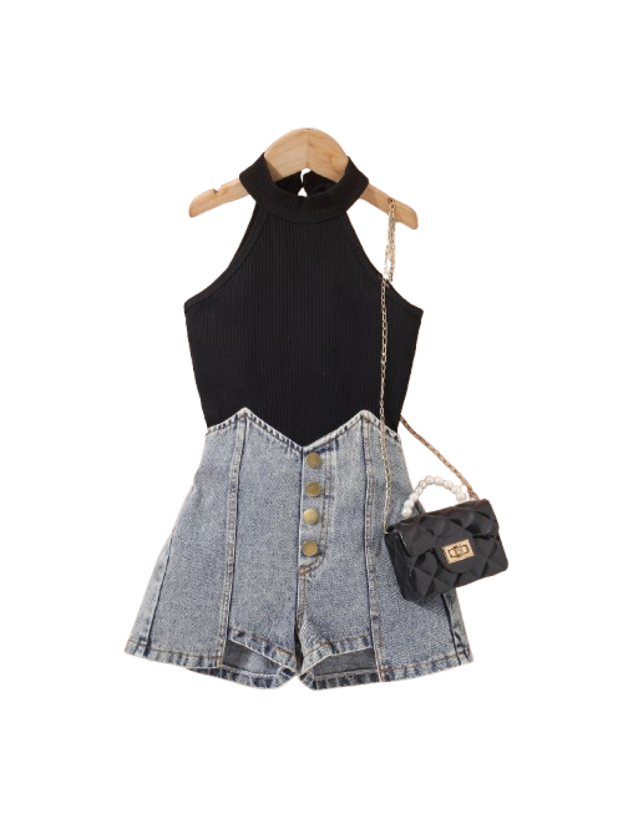 Un set adorabil și confortabil, perfect pentru micile domnișoare! Acest outfit este format dintr-un maiou negru simplu, confecționat din bumbac moale, ideal pentru zilele călduroase de vară, și pantaloni scurti moderni din denim, ușor elastici, cu talie confortabilă și croială lejeră pentru libertate de mișcare.