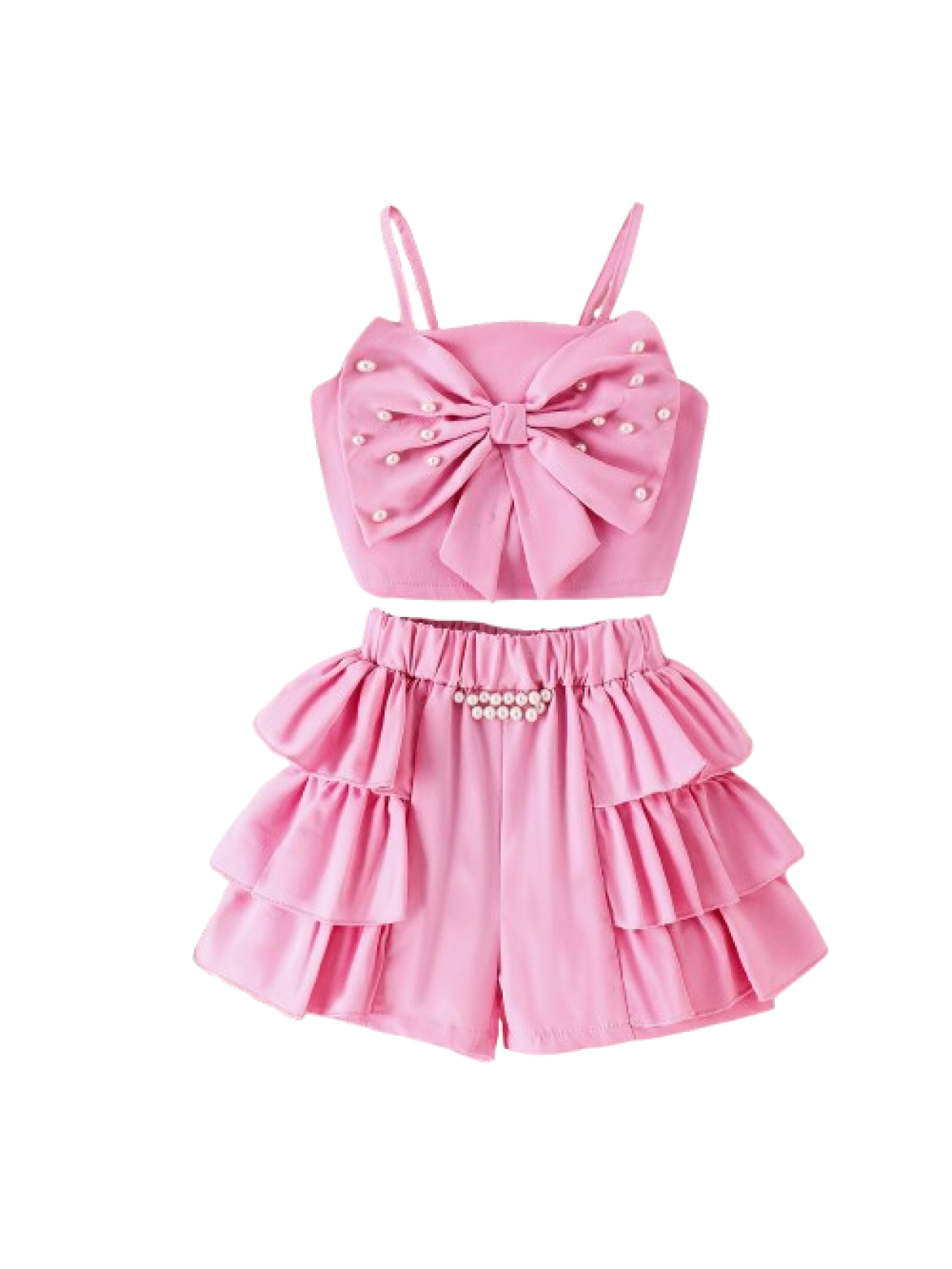 Un set adorabil și confortabil, perfect pentru micile domnișoare! Acest outfit este format dintr-un maiou decorat cu o fundita cu perlute, confecționat din bumbac moale, ideal pentru zilele călduroase de vară, și pantaloni scurti moderni , ușor elastici, cu talie confortabilă și croială lejeră pentru libertate de mișcare.