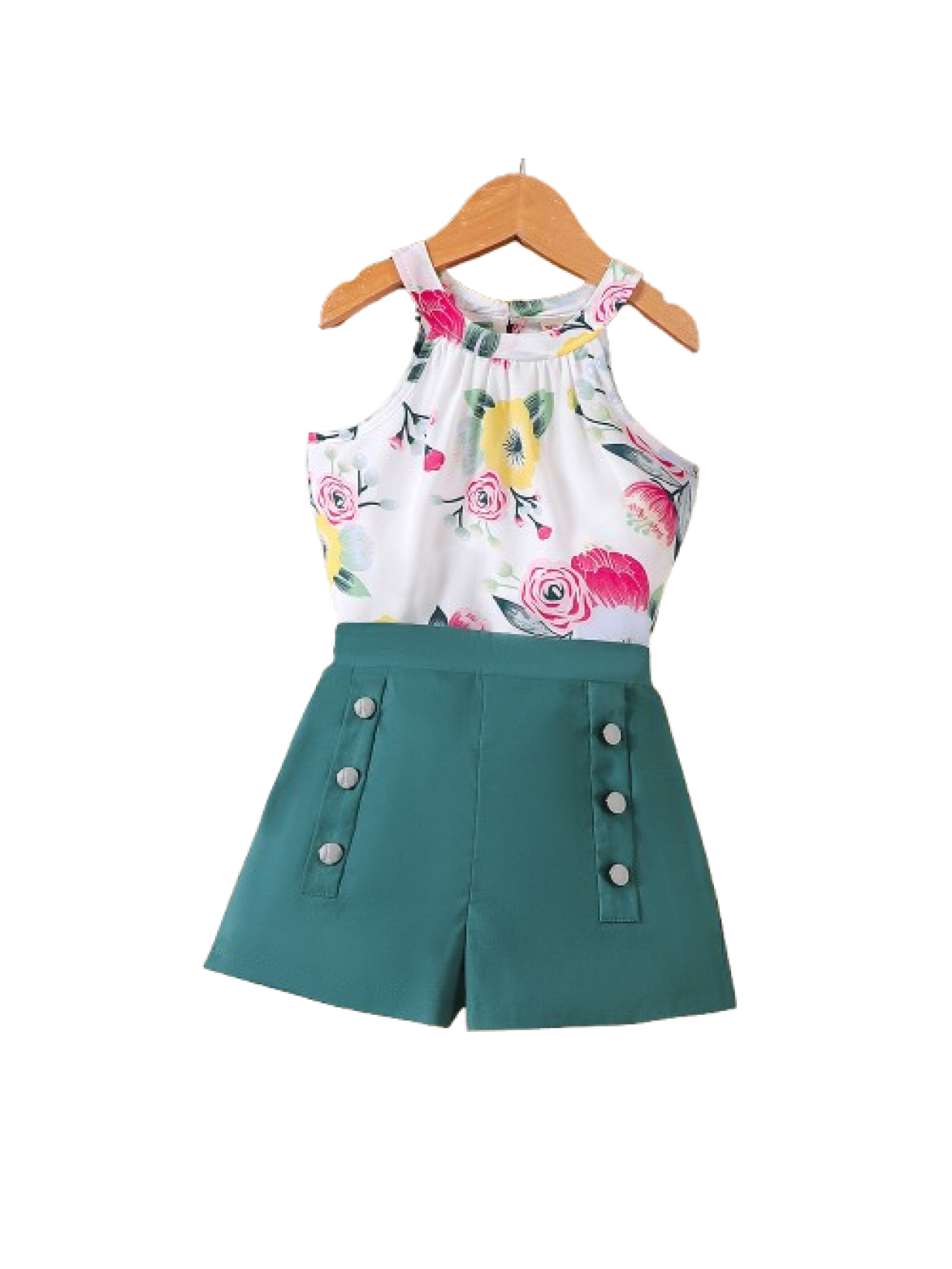 Un set adorabil și confortabil, perfect pentru micile domnișoare! Acest outfit este format dintr-un maiou alb cu imprimeu floral , confecționat din bumbac moale, ideal pentru zilele călduroase de vară, și pantaloni scurti albastri moderni, cu talie confortabilă și croială lejeră pentru libertate de mișcare.