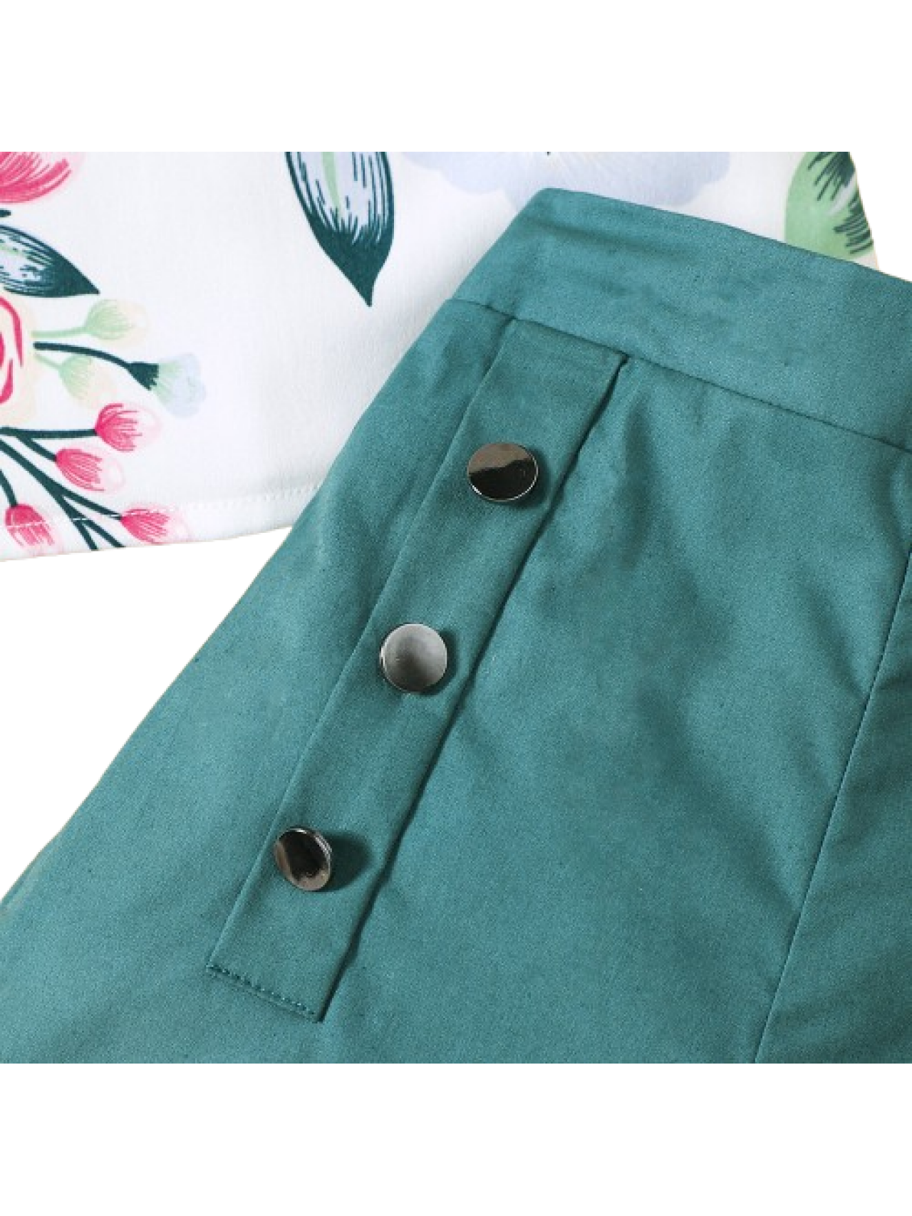 Set fete 2 piese - maieu alb cu imprimeu floral si pantaloni scurti verzi 3-5 ani